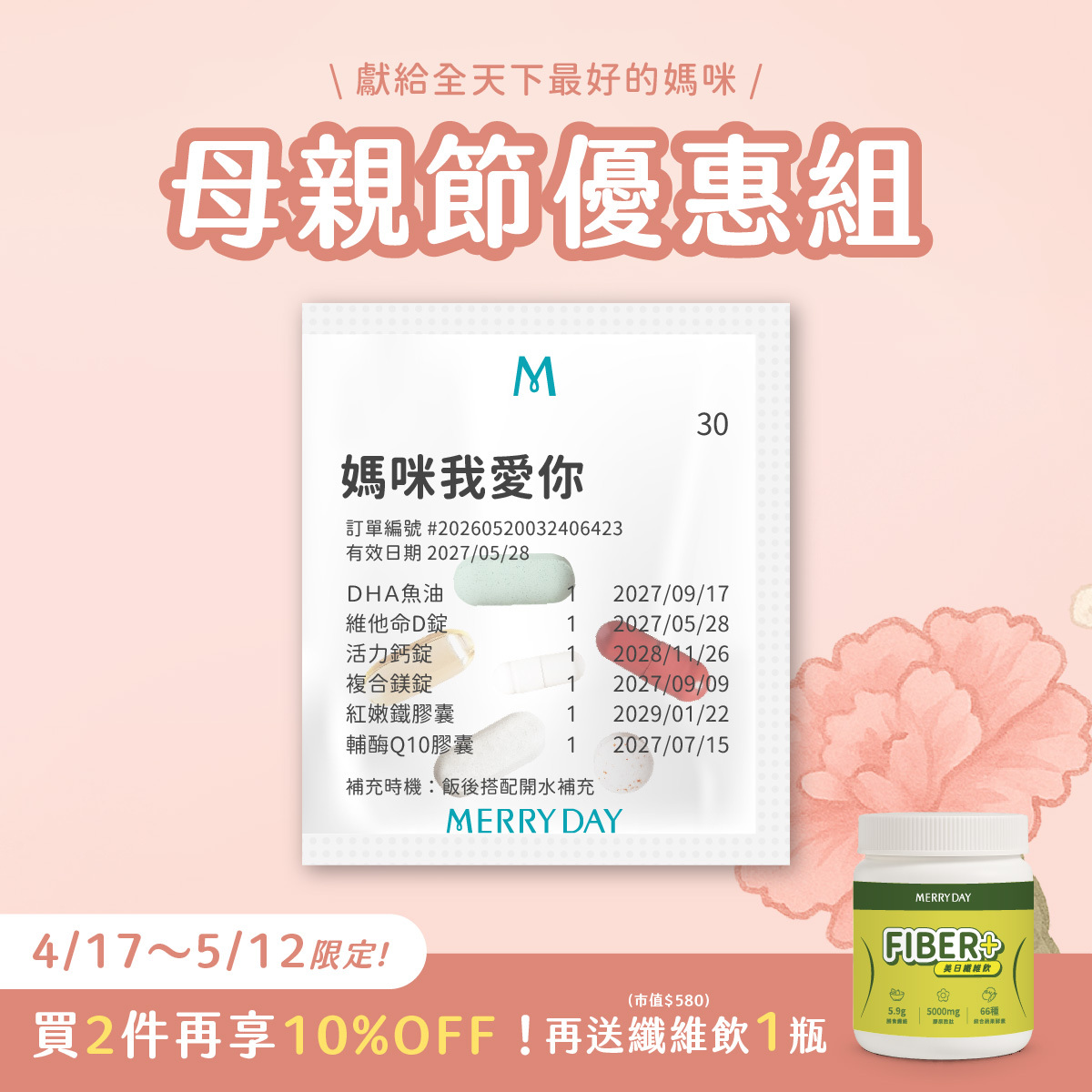 至2026-05-12T16:00:00.000+00:00截止 指定商品,獻給親愛的媽咪🎁購買 2 件母親節優惠組再送FIBER+美日纖維飲 1 瓶(數量有限,送完為止)