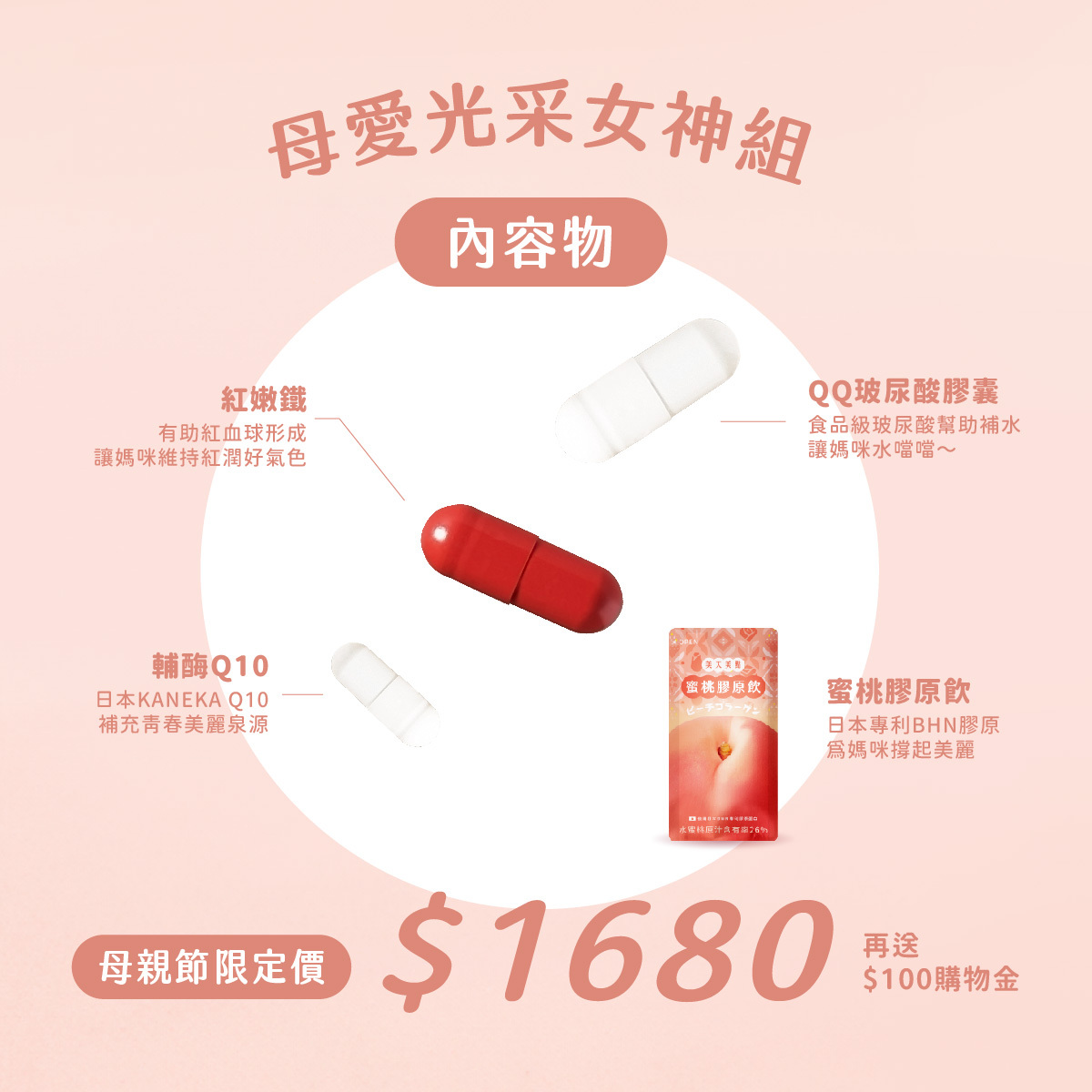 購買 1 組母親節優惠組,贈 蜜桃膠原飲 1 包